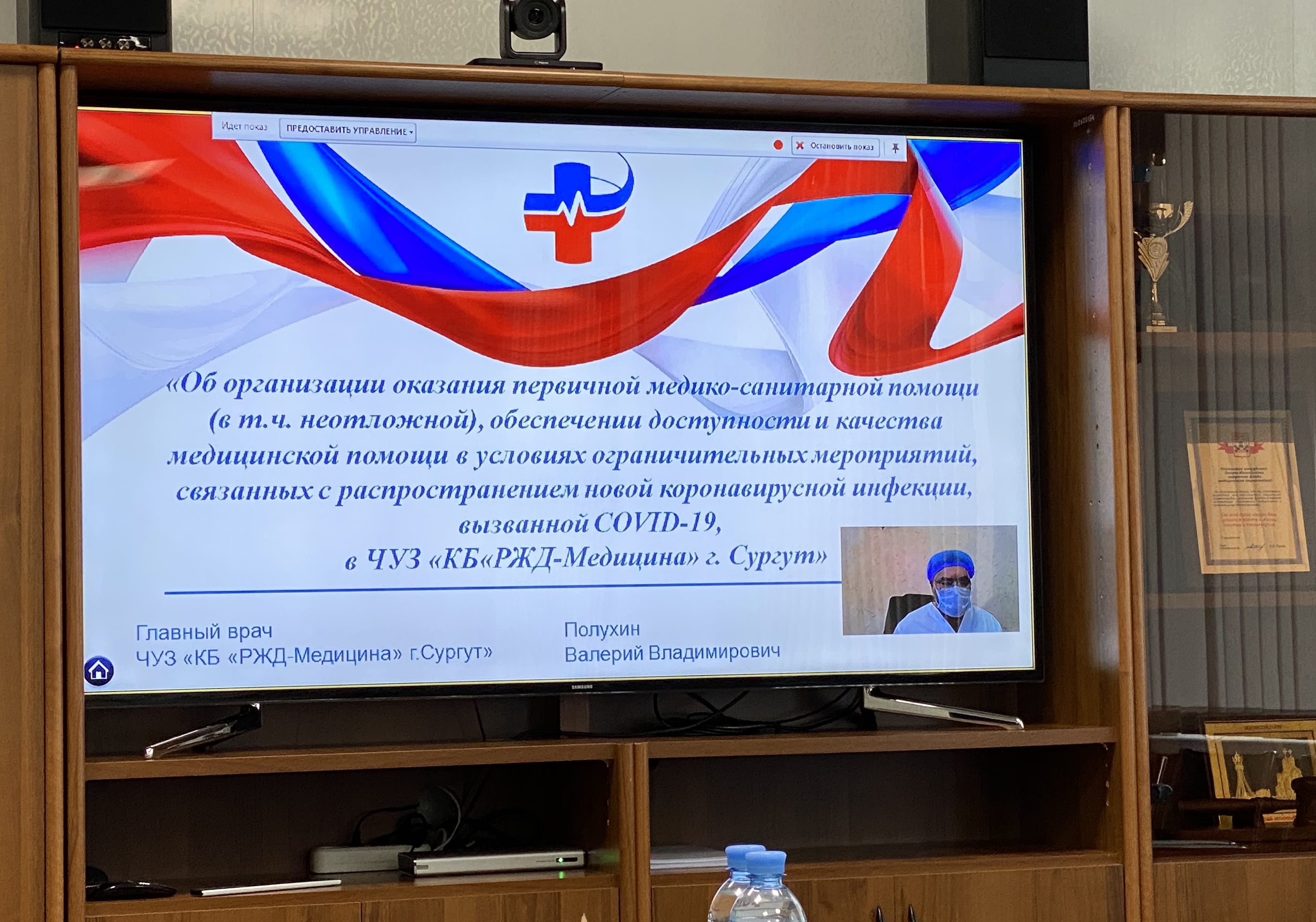 Также, по инициативе Департамента здравоохранения Ханты-Мансийского автономного округа – Югры был представлен к рассмотрению доклад главного врача ЧУЗ «Клиническая больница «РЖД-Медицина» г. Сургут Полухина Валерия Владимировича «Об организации оказания первичной медико-санитарной помощи (в том числе неотложной), обеспечении доступности и качества медицинской помощи в условиях ограничительных мероприятий, связанных с распространением новой коронавирусной инфекции, вызванной COVID-19 в ЧУЗ «Клиническая больница «РЖД-Медицина» г. Сургут».